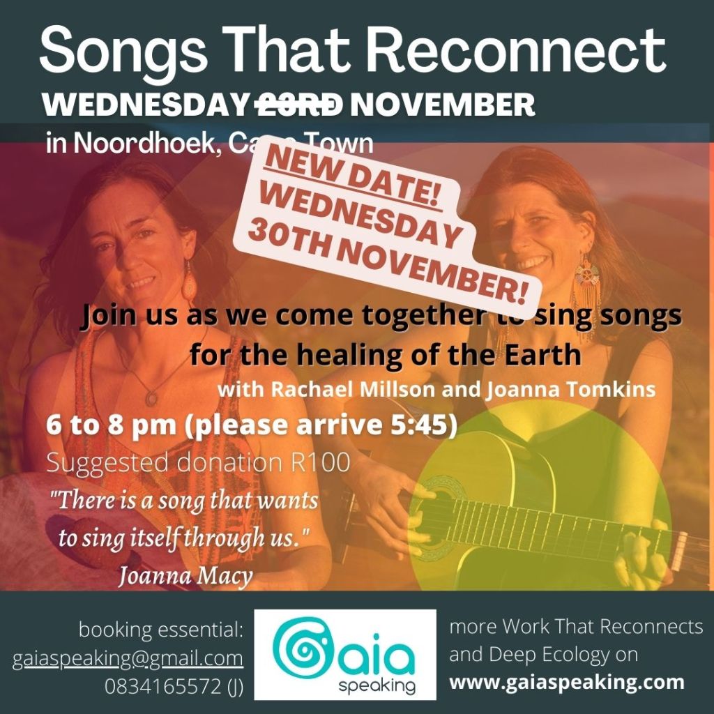 Join us on Wednesday 23rd November, 6-8pm in Noordhoek (Cape Town) as we gather and sing together our healing songs for the Earth. Our songs are offered as a profound way to open our hearts to our true selves, to each other and to our beloved Mother Earth.