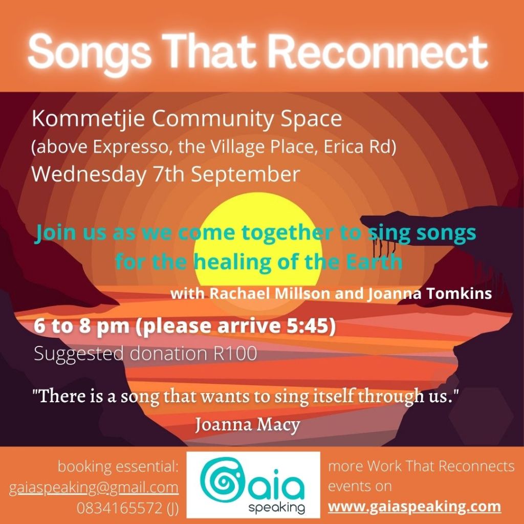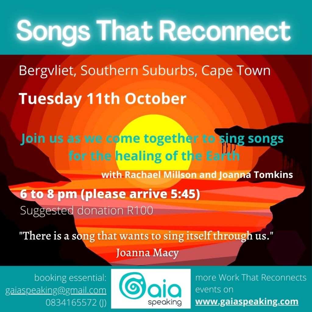 We gather in Cape Town Southern Suburbs this time to sing our belonging to our dear Earth and collectively sound our intentions. We welcome all voices, all genders, and children are welcome on request. Bring your shakers, instruments, and importantly a cushion. Please arrive 15 min early. We need your confirmation please! Invite more of us to join the movement!On donation (R100 suggested)