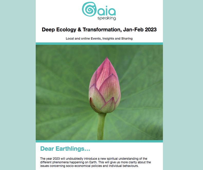 A monthly read that includes highlights from the blog, including updates about deep ecology and transformation movements worldwide, as well as and local or online events and practices. Join our community.